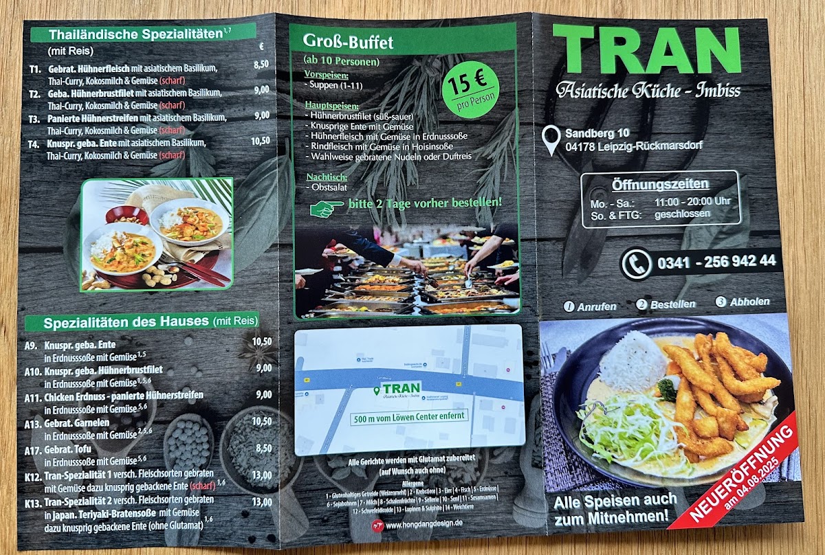 What stands out is the commitment to fresh, quality ingredients and generous portions that satisfy both casual diners and those seeking a quick yet flavorful Asian snack. Customers praise the flavorful, well-balanced dishes—such as the tender, peanut-sauced duck or the perfectly fried udon noodles—and the friendly, efficient service which enhances the welcoming atmosphere. TRAN Asian Küche caters well to varied tastes with options for meat-eaters and vegetarians alike, promising a reliable and enjoyable dining experience in Leipzig.